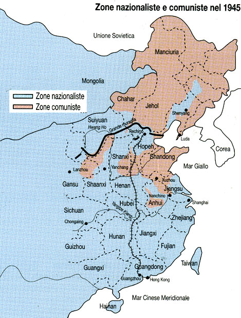A questo stato di cose cercò di porre riparo il Guomindang (allora: Kuo min tang) guidato da SunYat Sen: ebbe successo nell’ eliminare, l’uno dopo l’altro “i signori della guerra” ma poi dovette fronteggiare l’invasione dei nuovi barbari, i Giapponesi e si divise a sua volta nelle due correnti comunista (minoritaria) e anti comunista (maggioritaria).