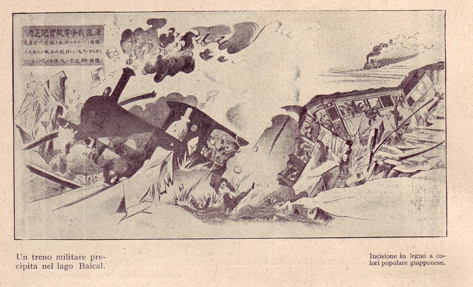 Un treno russo precipita nel lago Baikal: illustrazione giapponese su legno