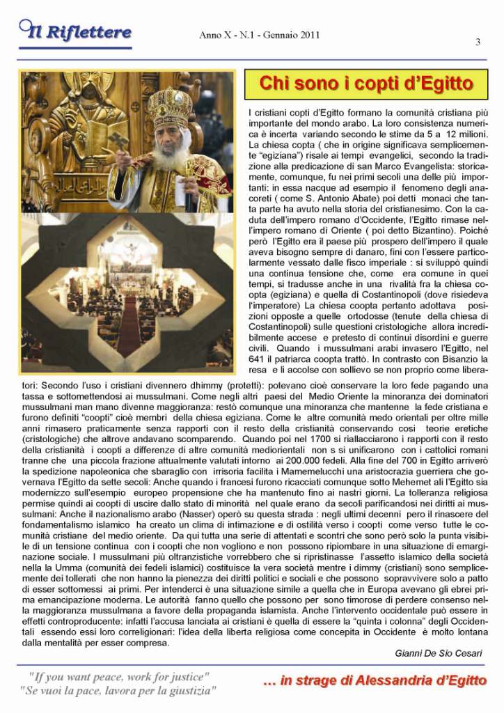 I cristiani copti d’Egitto formano la comunità cristiana più importante del mondo arabo. La loro consistenza numerica è incerta variando secondo le stime da 5 a 12 milioni. La chiesa copta ( che in origine significava semplicemente “egiziana”) risale ai tempi evangelici, secondo la tradizione alla predicazione di san Marco Evangelista: storicamente, comunque, fu nei primi secoli una delle più importanti: in essa nacque ad esempio il fenomeno degli anacoreti ( come S. Antonio Abate) poi detti monaci che tanta parte ha avuto nella storia del cristianesimo