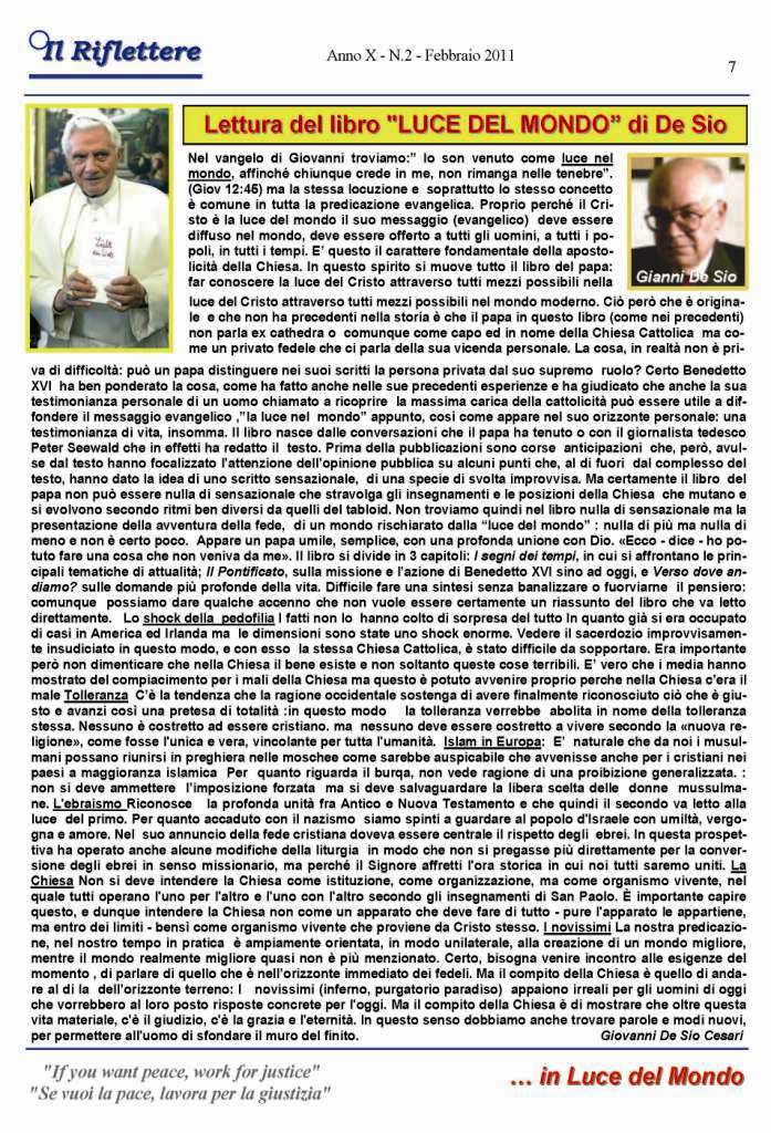 Nel vangelo di Giovanni troviamo :” Io son venuto come luce nel mondo, affinché chiunque crede in me, non rimanga nelle tenebre”. (Giov 12:45) ma la stessa locuzione e soprattutto lo stesso concetto è comune in tutta la predicazione evangelica. Proprio perchè il Cristo è la luce del mondo il suo messaggio (evangelio) deve essere diffuso nel mondo, deve essere offerto a tutti gli uomini, a tutti i popoli, in tutti i tempi. E’ questo il carattere fondamentale della apostolicità della Chiesa. In questo spirito si muove tutto il libro del papa: far conoscere la luce del Cristo attraverso tutti mezzi possibili nel mondo moderno
