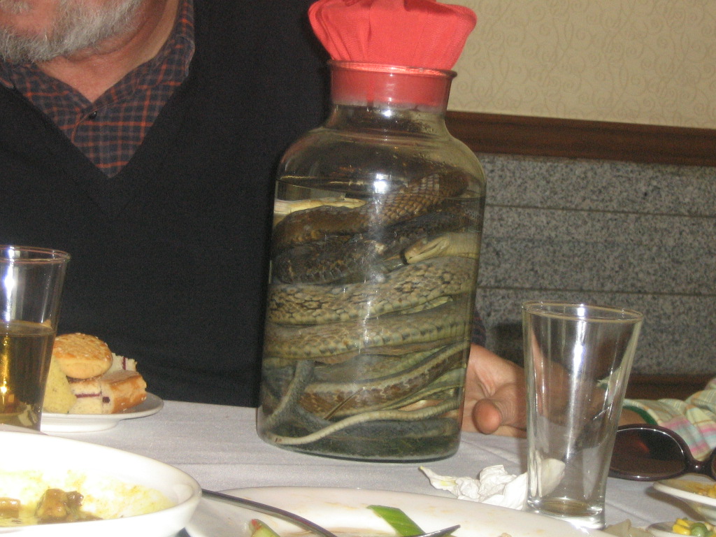 TOPI E SERPENTI In uno dei ristoranti viene servito, a richiesta, il brandy dei tre serpenti; in una grossa bottiglia effettivamente vi è del brandy che è stato fermentato con tre serpenti che si vedono nella bottiglia: qualcuno degli occidentali prova e riferisce che è buono, altri invece sono naturalmente restii. A richiesta si possono anche mangiare, in alcuni locali, topi e serpenti: una delle guide ci accompagna a vederli nelle gabbie in un sottoscala di un ristorante con un puzzo tremendo: usciamo tutti nauseati e inorriditi.