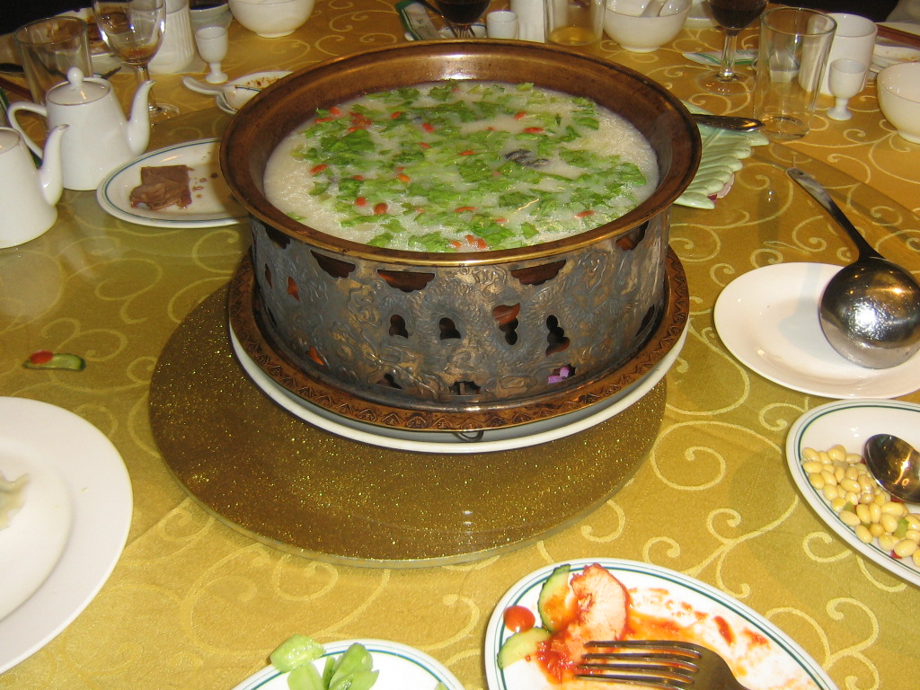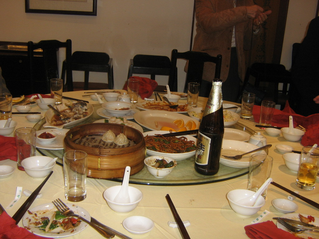 La cucina cinese è abbastanza diversa da quella in uso nei ristoranti cinesi dell’Occidente ed era sempre veramente squisita- Ci aspettavamo di mangiare molto riso ma ne abbiamo assaggiato invece pochissimo: il riso infatti viene usato più o meno come da noi il pane: non costituisce tanto un cibo a sè ma accompagna tutti gli altri cibi e quindi in genere viene servito in tavolo semplicemente in bianco, senza nessun condimento: ciascuno ha una piccola ciotola nella quale mettere il riso che si desidera attingendolo dal piatto comune. Poichè esso era insapore e non sapevamo come usarlo, generalmente restava sul tavolo I cinesi,a differenza degli occidentali, usano sminuzzare la carne e il pesce a piccolissimi pezzettini e quindi questo viene cucinato con forti aromi agri e dolci, In realtà è difficile comprendere quello che si sta mangiando: i sapori sono fortemente alterati e l’aspetto non aiuta per niente: anche il pesce può essere facilmente scambiato per carne: si facevano scommesse su cosa stessimo mangiando: in qualche ristorante la cameriera nel portare in tavolo diceva cosa fosse nei buffet invece era scritto. Vi erano poi i vermicelli di soia in genere molto buoni , brodi e zuppe varie che nessuno prendeva perchè non si sapeva cosa fossero. Presenti anche varie verdure crude e cotte: ci sconsigliavano quelle crude per precauzione igienica e attenzione a quelle cotte, alcune delle quali avevano un potere lassativo piuttosto accentuato I ravioli sono poi una specialità, soprattutto di Xi’an: in un pranzo ce ne offrirono ben 18 tipi diversi: in verità, poichè vengono serviti senza alcun condimento, in realtà appaiono piuttosto insapori . Da notare che i gelati confezionati sono italiani, con scritte cinesi, naturalmente