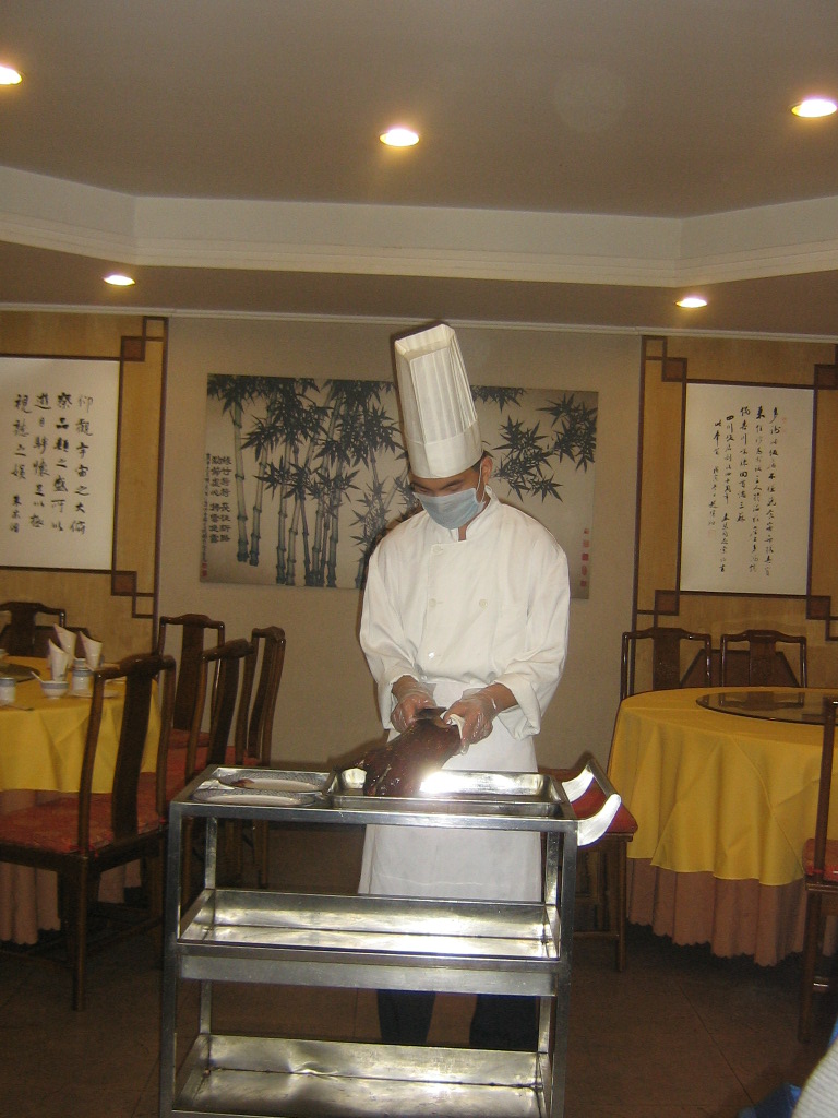L'ANITRA LACCATA E' un'altra specialità presentata nel programma di viaggio come un elemento caratterizzante A fine pranzo infatti si presenta un cuoco con tutto un apparato scenico e tratta questa famosa anatra, non capiamo, in verità, in qual modo: alla fine viene poi tagliata in sottilissime fettine con grande disappunto di chi si aspettava di poter gustare una robusta coscia e si era tenuto leggero nel pasto: una cameriera mostra a uno dei commensali come si mangia: si prende con le bacchette una sottile sfoglia di riso, la si spalma tutta con una salsina dolce, si mette quindi la fettina di anatra, si rinchiude il tutto come un involtino e si mangia. L’operazione è lunga e laboriosa anche per le pratiche e svelte mani cinesi: figuratevi per degli impaziente e imbranati occidentali. Tuttavia alla fine ci riusciamo ma non sentiamo alcuna sapore squisito anzi appare decisamente deludente. Qualcuno allora prova a prendere e mangiare direttamente la fettina di anatra ma questa risulta piuttosto sgradevole senza l’apparato di sfoglia e salsina. Buona parte della preziosa anatra rimane nel piatto comune.,.qualcuno cerca di recuperare gli avanzi dei cibi prima serviti ,