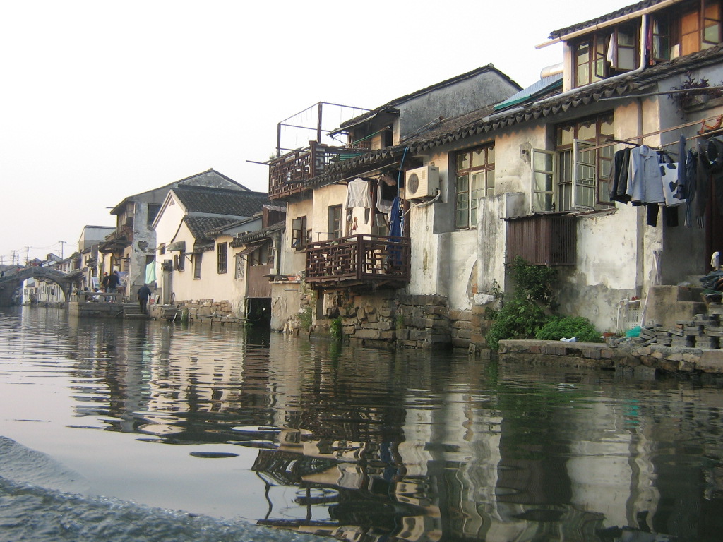 Una veduta dal battello del canale principale di Suzhou che Marco Polo paragonò a una grande Venezia . Non si vedono che misere case, niente certamente che possa ricordare lo splendore di San Marco o del Palazzo Ducale. . .