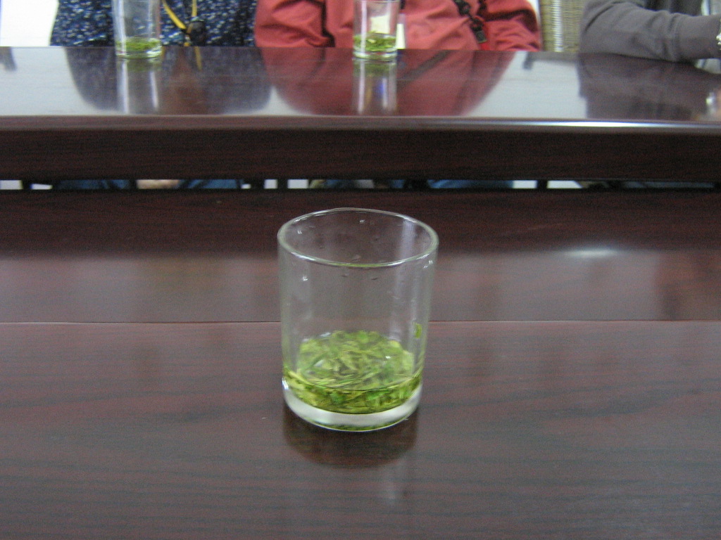 Ci riunirono quindi in una sala intorno a un lungo tavolo: qui dei cinesi si alternarono a illustrare i pregi del loro the ( ovviamente un interprete traduceva). A ognuno venne dato un bicchiere con le foglioline, quindi con una abilità tutta particolare, veniva versata acqua bollente: praticamente dovevamo bere l'acqua calda : a me e ad altri veramente ci veniva di dar di stonaco e non sapevamo come fare per non offendere quelli che ce lo offrivano come un prodotto raro e prezioso. Alla fine poi, come al solito, si poteva comprare il the: il prezzo ci sembrò molto alto ma dicevano che si trattava di una qualità particolarmente pregiata; a me veramente sembrava solo acqua calda ma io non amo molto il the. Invece erano in vendita dovunque, nei distributori, a modesto prezzo ( 3 o 4 Yuen , cioè 30 o 40 cent. ) bottigliette di "Lu Cià" (infuso di the), freddo e molto gradevole e dissetante di cui facemmo grande uso.