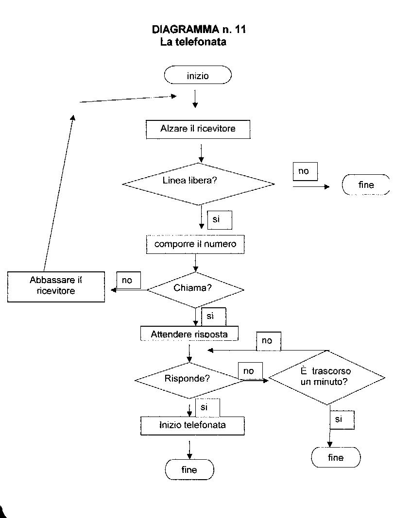 Pierino telefona. Alza il ricevitore,se la linea non è libera ,fine della sequenza. Se la linea è libera compone il numero:se non vi è segnale di chiamata (occupato o altro) ricomincia la sequenza.Se il segnale di chiamata è presente ,si chiede se vi è risposta. Tuttavia si chiede anche se è passato un minuto e se la risposta è affermativa avremo ancora la fine della sequenza. Senza questo ultimo test aspetterebbe all'infinito nel caso che non ci fosse risposta,Se ci sarà risposta inizierà la telefonata.