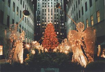 Si avvicina Natale e l'America si riveste a festa come non mai. Le strade delle città, palazzi e grattacieli tutto risplende di mille luci colorate. A New York, Rockfeller Center sfarzosamente decorato con immagini natalizie, festoni e ghirlande luci multicolori e' un via vai di gente in continuo movimento. Molti si fermano a guardare i pattinatori nel laghetto sotto il grande albero di Natale che si riflette brillando nel ghiaccio. Ovunque passi, ovunque ti rechi musica e canzoni e canti gioiosi. La gente cammina canterellando. Vetrine animate e colorate gareggiano a richiamare i clienti e mostrano i più raffinati regali . Le case dentro e fuori, finestre e portoni giardini e vialetti tutto e' decorato a festa . Gli alberi spogli ritornano a nuova vita con i rami avvolti in cavi di luci colorate. Il sagrato delle chiesi i giardini delle case sfoggiano le piu' belle natività con luci calde e soffuse. Molti anche i presepi viventi. Non mancano i Santa Claus e l'uomo di neve.