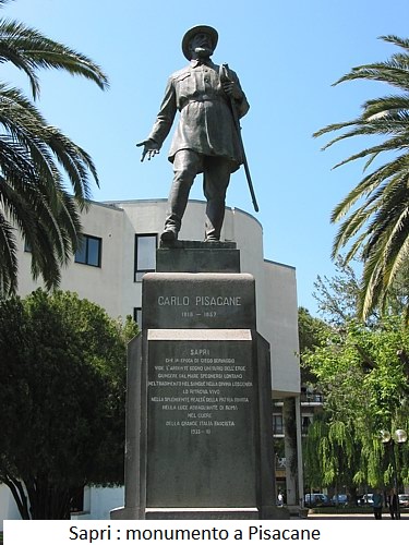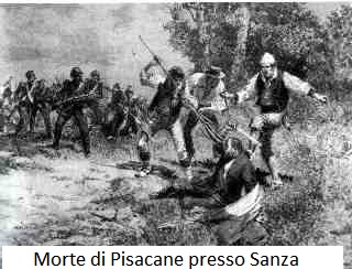 detenuti di cui solo alcuni erano politici e con essi sbarcò a Sapri. Risalendo i monti verso l’ interno si aspettava folle di contadini acclamanti e invece trovò solo ostilità e diffidenza. Fu accolto solo da qualche borghese liberale :uno di essi, Federico Romano lo ospitò nel suo palazzo, a Padula tentando per altro di dissuaderlo dal suo proprosito. Al primo scontro i suoi compagni raccogliticci furono uccisi, si arresero , si dispersero. Con pochi superstiti fuggì anche lui ma presso Sanza quei contadini, su cui sperava per la rivoluzione, lo assalirono con armi di fortuna e li massacrarono: solo qualcuno riuscì fortunosamente a scampare e fu consegnato ai gendarmi del re. In realtà furono scambiati per brigati e in effetti molti degli uomini che erano con lui erano delinquenti comuni che Pisacane volle credere di poter trasformare in rivoluzionari con un atto di fede