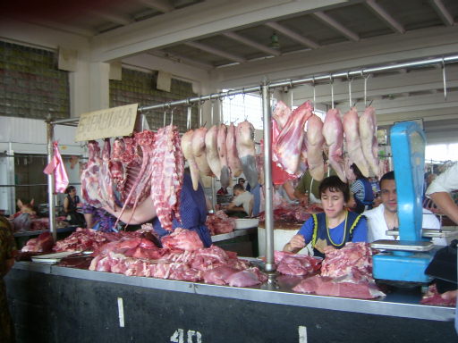 La carne viene esposta con poca igiene nei banchi : non si riconoscono i nostri pezzi. Non esistono macchine per tagliare a fette (non conoscono le bistecche): I prezzi sono cari relativamente agli stipendi e quindi la si consuma molto di rado.